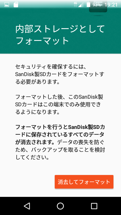 Step6.内部ストレージとしてフォーマットする旨の確認画面で「消去してフォーマット」をタップ。