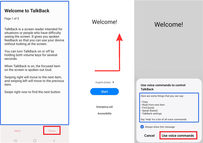 ステップ3:最初の「ようこそ」画面に戻ります。音量ボタンの「上」と電源ボタンを同時に3秒間長押しして、TalkBackを有効にします。
