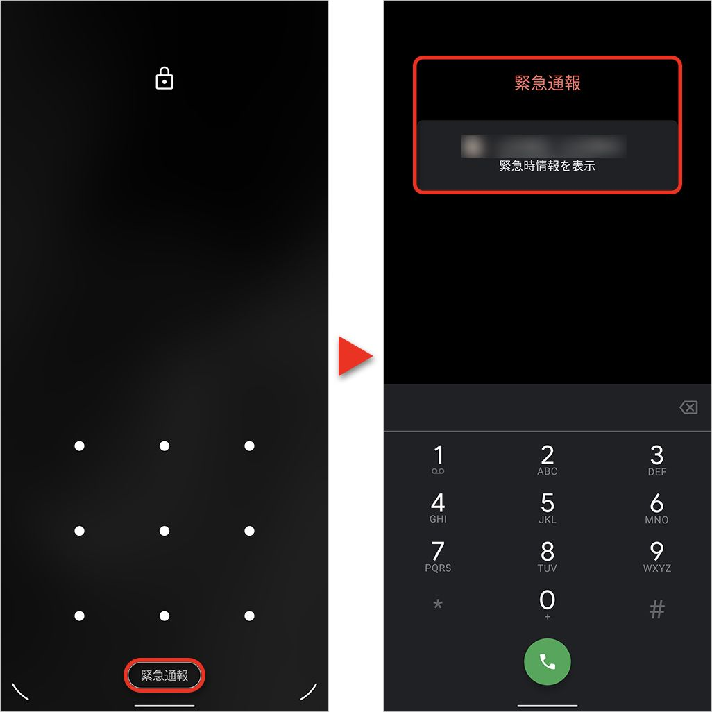 「緊急通報」とは、Android端末のロック画面から、パスワードや指紋認証などのロックを解除しなくても、緊急時に必要な連絡先(例:110、119などの共通緊急番号)に電話をかけられる機能のことです。
