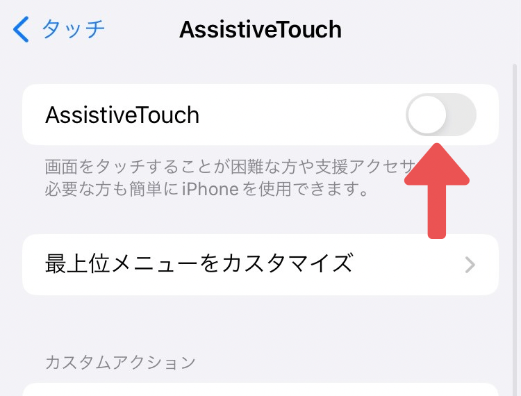 「設定」>「一般」>「アクセシビリティ」>「AssistiveTouch」オンにします。