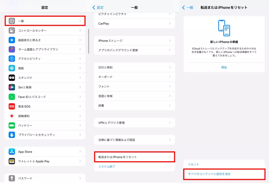 Step1:「設定」>「一般」>「転送またはiPhoneをリセット」>「すべてのコンテンツと設定を消去」の順にタップし、iPhoneをリセットします。