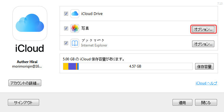 Step3:iCloud写真、iCloud Drive、メール、連絡先、カレンダーなど、パソコンと同期したい項目にチェックを入れ、「適用」をクリックします。