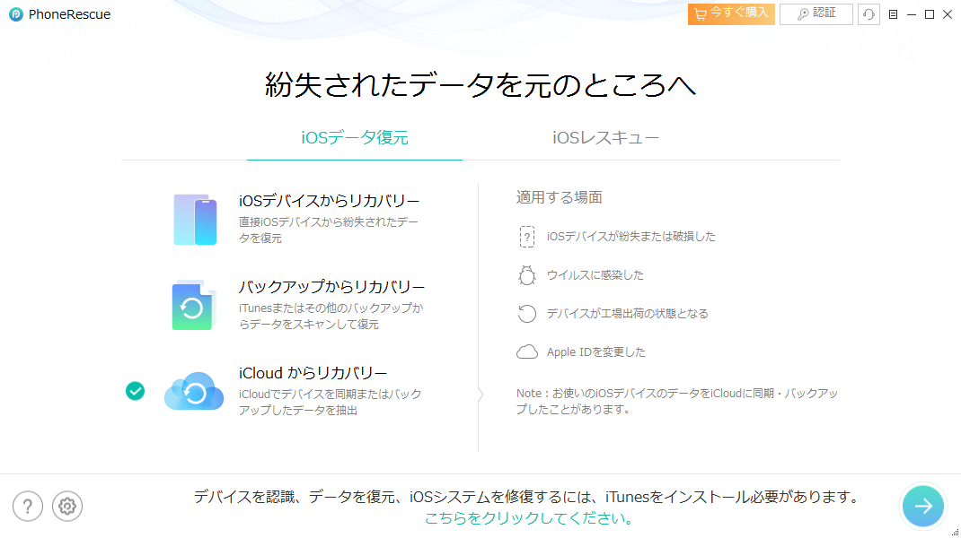 Step2:PhoneRescueを起動し、iCloudからリカバリーを選択します。
