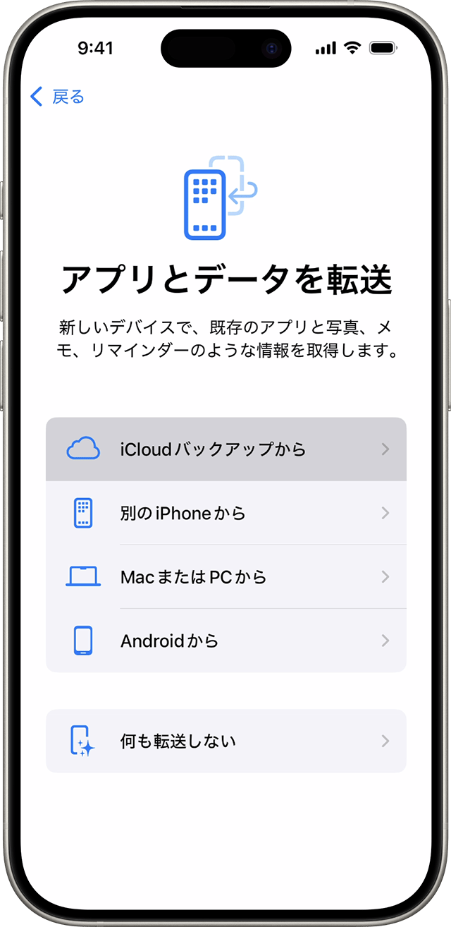 Step2:次に、「アプリとデータ」画面に移動し、「iCloud バックアップから」を選択します。