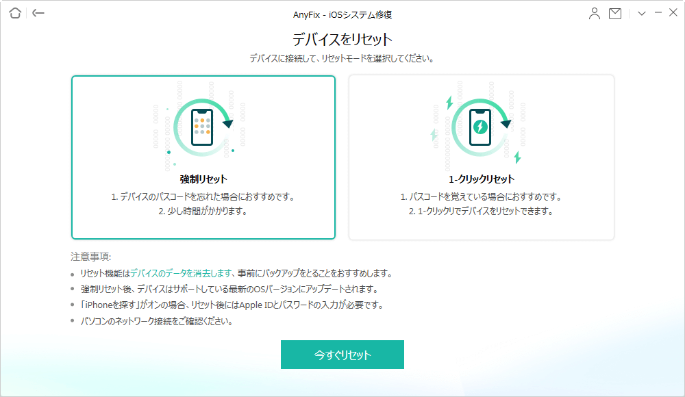 Step2.「強制リセット」を選択し、「今すぐリセット」をタップします。
