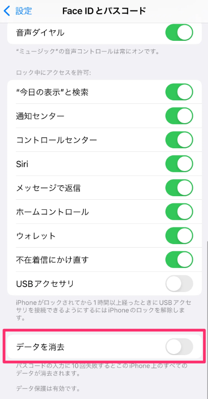 Step2.画面を下にスクロールし、「データを消去」をオンにします。