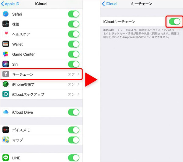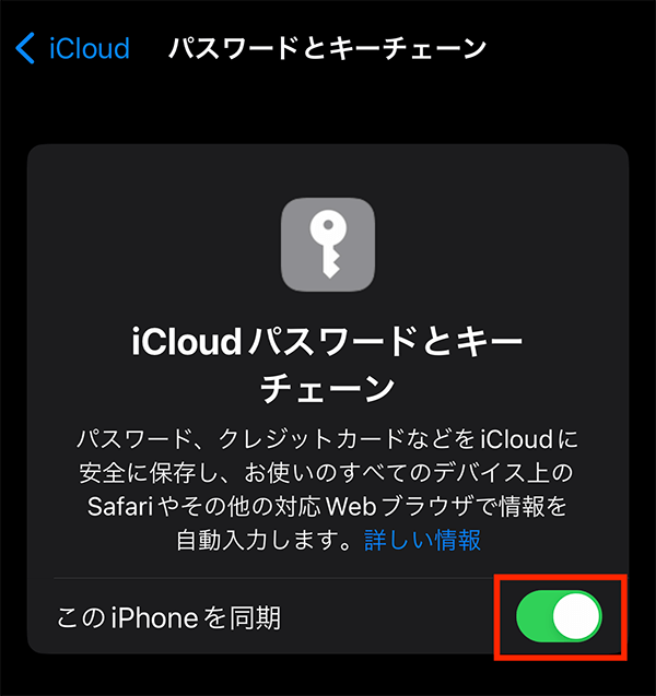 「設定」>「ユーザー名」>「iCloud」>「iCloudパスワードとキーチェーン」の順でクリックします。iCloudキーチェーンがオンになっていることを確認します。