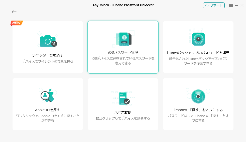 AnyUnlockはiPhone専用のパスワード解除ツールで、バックアップを暗号化しても簡単に解決できます。あらゆる種類のiPhoneパスワードを解除する強力な機能を備えて、ロック画面も解除できます。同時に、iPhoneデバイスの各種パスワードを管理する優れた機能も有しています。AnyUnlockはiOSデバイス上の各種パスワードを検索・表示・エクスポートでき、たった1つのAnyUnlockでいつでもどこでもiOSデバイスの全パスワードをエクスポート・管理できます。