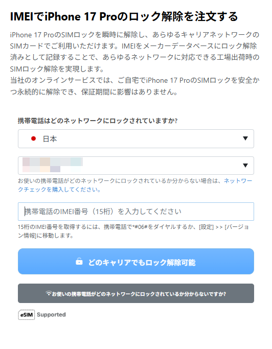 Step2. 次の画面で、キャリアを確認し、IMEI番号を入力します。*#06#で確認できます。「どのキャリアでもロック解除可能」を選択し、進んでください。