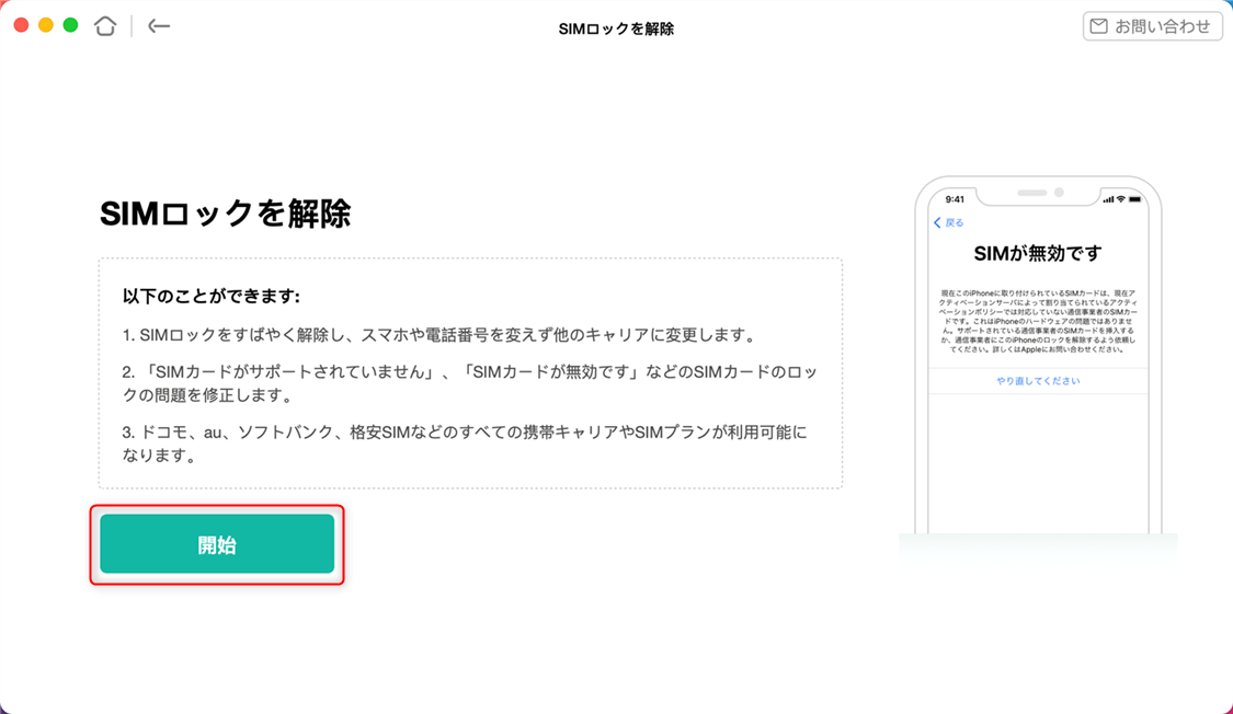 Step2. iPhoneをUSBケーブルでコンピュータに接続し、情報を確認して、解除を開始します。「開始」をクリックします。