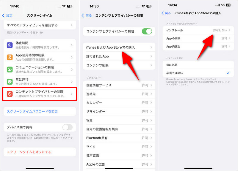 Step5.「インストール」、「Appの削除」、「App内課金」を一つずつにタップし、「許可しない」を選択します。