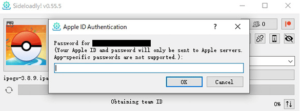 途中でApple IDのパスワード入力が求められますが、これはアプリに署名するためにAppleのサーバーへ送信されるもので、Sideloadly側に保存されることはありません。