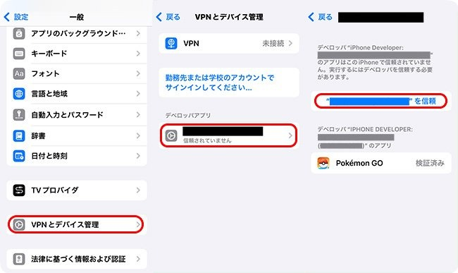 iPhoneで「設定」→「一般」→「VPNとデバイス管理」に進み、「デベロッパApp」の項目に表示されているサブ用Apple IDをタップします。その後「信頼」をタップすることで、インストールが完了します。