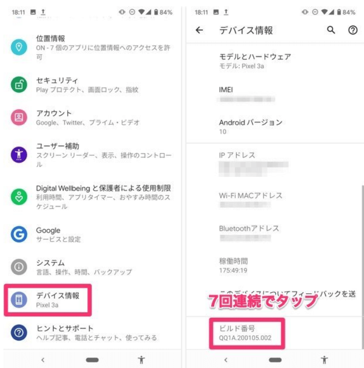 このメニューは初期状態では非表示になっています。「設定」→「デバイス情報(端末情報)」に進み、「ビルド番号」を7回連続でタップしてください。すると「これであなたも開発者です!」という通知が表示されます。