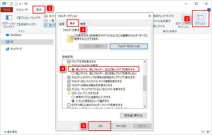 「表示」タブを開き、「ファイルとフォルダー」セクションで「隠しファイル、隠しフォルダー、および隠しドライブを表示する」にチェックを入れます。その後、「OK」をクリックして変更を保存します。
