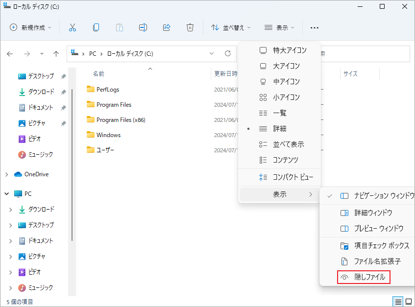 「表示」タブを選択し、「表示」>「隠しファイル」をクリックします。すると、すべての隠しフォルダが画面に表示されます。