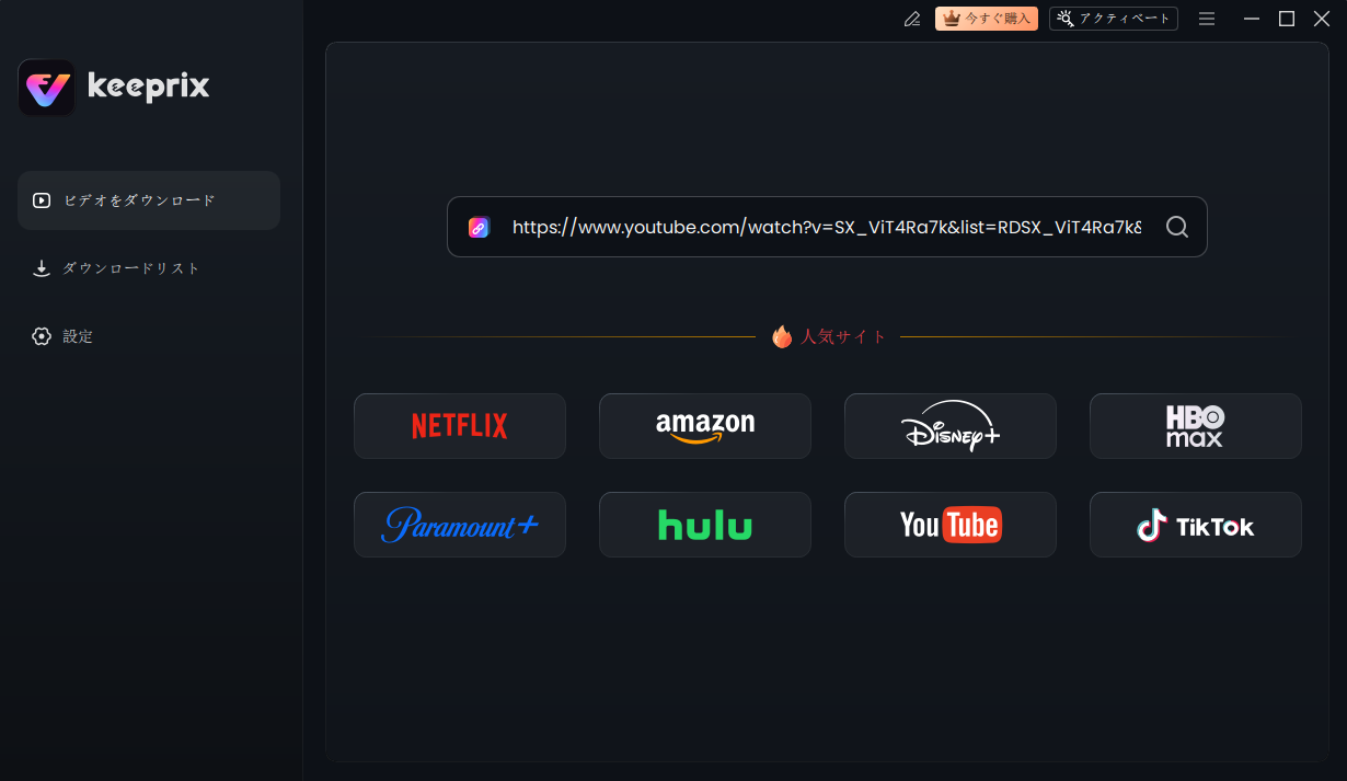 URLを貼り付けて動画を迅速かつ信頼性高くダウンロードする場合、Keeprixが最も簡単な解決策です。多くのオンラインコンバーターが不安定で制限されているのに対し、Keeprixはストリーミング制限を回避し、コンピューターに直接動画を保存するために設計されたプロフェッショナルなデスクトップツールです。多くのストリーミングサイトをサポートし、好きな動画を永久的に保存し、品質の損失なく利用できます。また、TikTokのロゴとIDなしで動画をダウンロードすることも可能です。